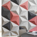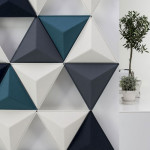The modules are assembled together using small plastic clips, and each module is angled and has a tapered shape. The pattern formed by combining several modules can be varied in a virtually infinite number of ways. The angles diffuse sound waves, and the product thus helps create a better sound environment. Aircone is made from compression-moulded fabric-covered fibre felt and is available in a range of colours. It can be hung from the ceiling or against the wall on an aluminium rail.