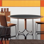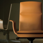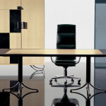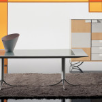 Bird executive desk by Margolis : the top tapers on its short side to the minimum thickness that is structurally possible. The shape is that of a stork’s beak or any other bird with an elongated, exaggerated beak thrusting out like a sword, a blade or a standard. The cylindrical legs open out fan-like at the bottom into slender metal structures with a gently curved conical section, like the legs of waders. The profile can thus be compared to that of a heron in the fields of the Po valley plain, immobile with its beak thrust forward and all its body weight resting on a thin leg, which broadens its support in the water with longer and increasingly more slender feet.