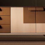 Leather natural, black, white. Glass, maple wood, steel, natural materials for a design that is based on zoomorphic and landscape images. The cabinets, in apparent contrast, are built around complex shapes alternating wood, leather and metal, as if in an abstract composition reminiscent of Mondrian interiors, but also similar to far-off glimpses of that same landscape flown over by long-beaked birds, where thickets of poplar trees, fields and rice paddies with their fragmentary property divisions seen from above, create complex, highly modern geometries.