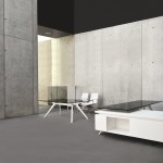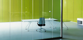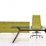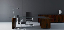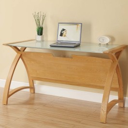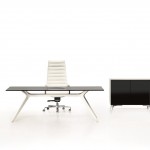 The glass desk top is available in Smoked Transparent or White painted finish.