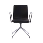 The swivel frame is made of injected aluminium polyamide. The back and seat are one piece of veneer beechwood, varnished or upholstered or the seat and back can be in one piece of injected polyurethane fully upholstered in fabric or soft shell.