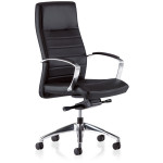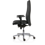 The Margolis Harly Forward Axis Tilt Mechanism executive chair upholstered in a black leather. Fixed polished aluminium armrest with a black polyurethane armrest. Polished aluminium base
