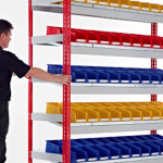 Each shelf is sloped to make reaching in and selecting a particular item easier, while the two bin arrangement aids stock rotation and replacement. When the front bin is emptied, the bin behind it takes its place, which leaves a clearly identifiable space when it comes to refilling.