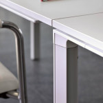 The aesthetic design centres on a shadow line along the structure and down the legs. The features are enhanced by the wide variety of finishes and combinations. A neatly formed channel on the underside of the table allows the insertion of a multi-function clip that can be used to secure and support a modesty panel, link tables together and support power cables as a ‘cable tidy’.