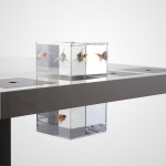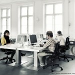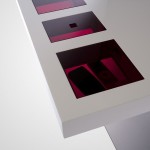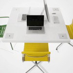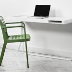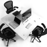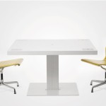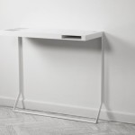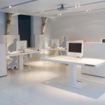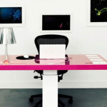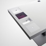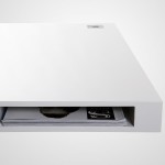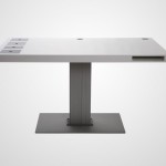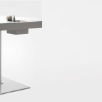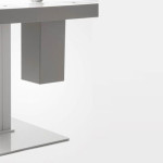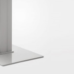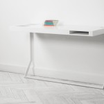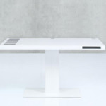 Desktop in white high-gloss. Choose between fixed or electric height adjustment. Column in white or alu. Feet in white or brushed alu.