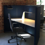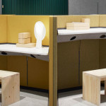 Instead of using legs, Poul Christiansen has integrated the table-top into the sound absorbent screens, thus freeing space. Both the cables and the mechanism for adjusting the height are hidden within the screen. My Hive also offers a place for rest, since the desk can be replaced with a sofa.