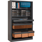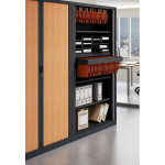 M1 fire resistant PVC tambour units available in 19 combinationsof finish. 9 heights & 3 widths available to chose from. Shelves are included & are equipped for lateral filing. Roll-out filing cradles are available as an option. All units can be floor levelled from the inside of the unit. For tight spaces, enquire about our flat-packed model.