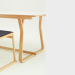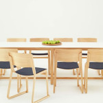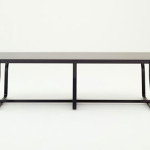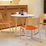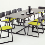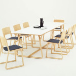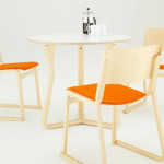 The Margolis Theo Tables is an elegant range of meeting and /or dining tables have round, square or rectangular tops and base frames relevant to each size and shape, from compact 3-legged to long parallel framed conference or refectory style with a craft heritage. Exposed plywood or solid edges, are clear lacquered, stained, or solid coloured, having a subtle cut-back convex profile visually reducing the edge thickness, thus enhancing the aesthetics. Tops are veneer or laminate.