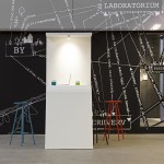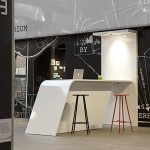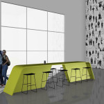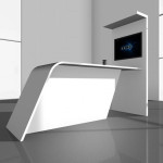 The reception desk is in a futuristic and minimalistic design that breaks the straight office space line.