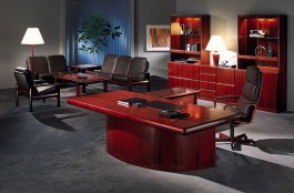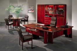Presidential desk with wooden top and black leather inlay. 2 pieces. Supported on 3 door side black piano lacquer credenza. Cable management.